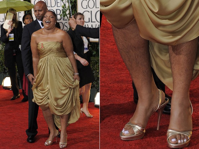 A atriz Mo'nique usou um vestido longo para ir ao Globo de Ouro na noite do último domingo (17), mas em um momento não muito feliz ela decidiu erguer um pouco a barra para os fotógrafos - que flagraram pernas sem depilação e bem cabeludas! Ela estava sorrindo e tão feliz (já que havia acabado de ganhar o prêmio de Melhor Atriz Coadjuvante) que talvez tenha esquecido de deixar as pernas por baixo do vestido....